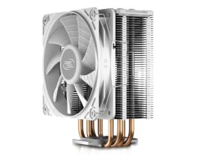 Wieżowa konstrukcja chłodzenia Deepcool GAMMAXX GTE V2 White odprowadza ciepło poprzez cztery miedziane ciepłowody. Każdy z nich ma sześć milimetrów średnicy i bezpośredni kontakt z procesorem, co powinno pozytywnie wpływać na efektywność coolera. Chłodne powietrze tłoczone jest przez wentylator o średnicy 120 mm z łożyskowaniem HDB, który rozświetlono białymi diodami LED.